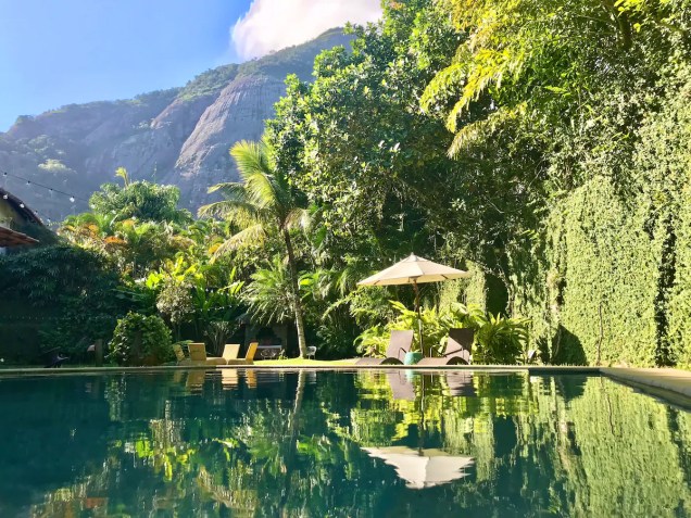 A casa: Dentro de um condomínio no bairro do Joá, perto da Praia da Joatinga, a Casa 10 já foi cenário de publicidades e filmes. O enorme jardim tem piscina, vista para o Pico dos Quatro, árvores frutíferas e um charmoso gazebo balinês. No segundo andar ficam a sala de estar e de jantar, varanda com toldo automatizado, cozinha equipada, piano, coleção de livros e quatro suítes que acomodam até oito adultos. Roupas de cama, toalhas, roupões, cangas, chinelos, cadeiras e barracas de praia estão disponíveis para os hóspedes. Os serviços de personal chef e camareira podem ser contratados à parte. Reserve aqui.