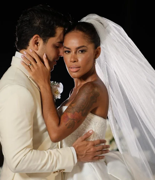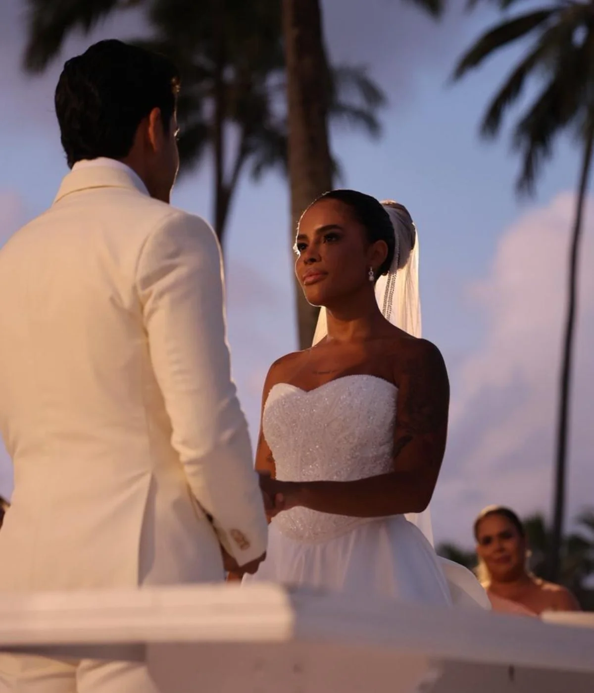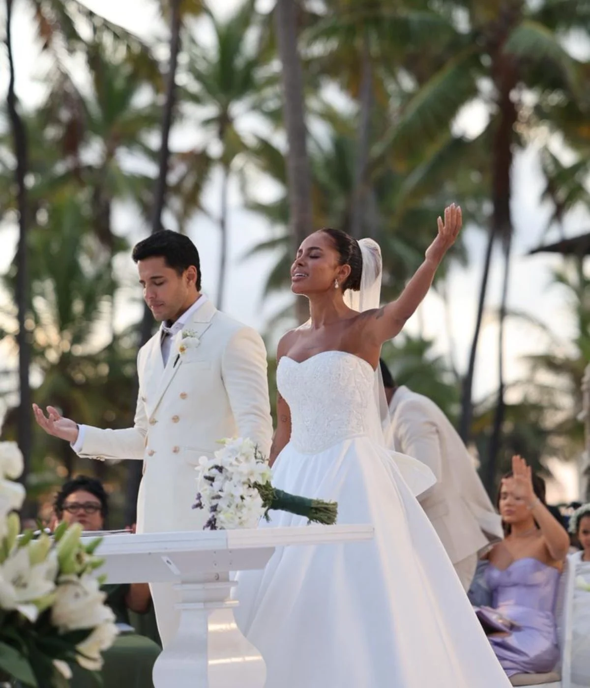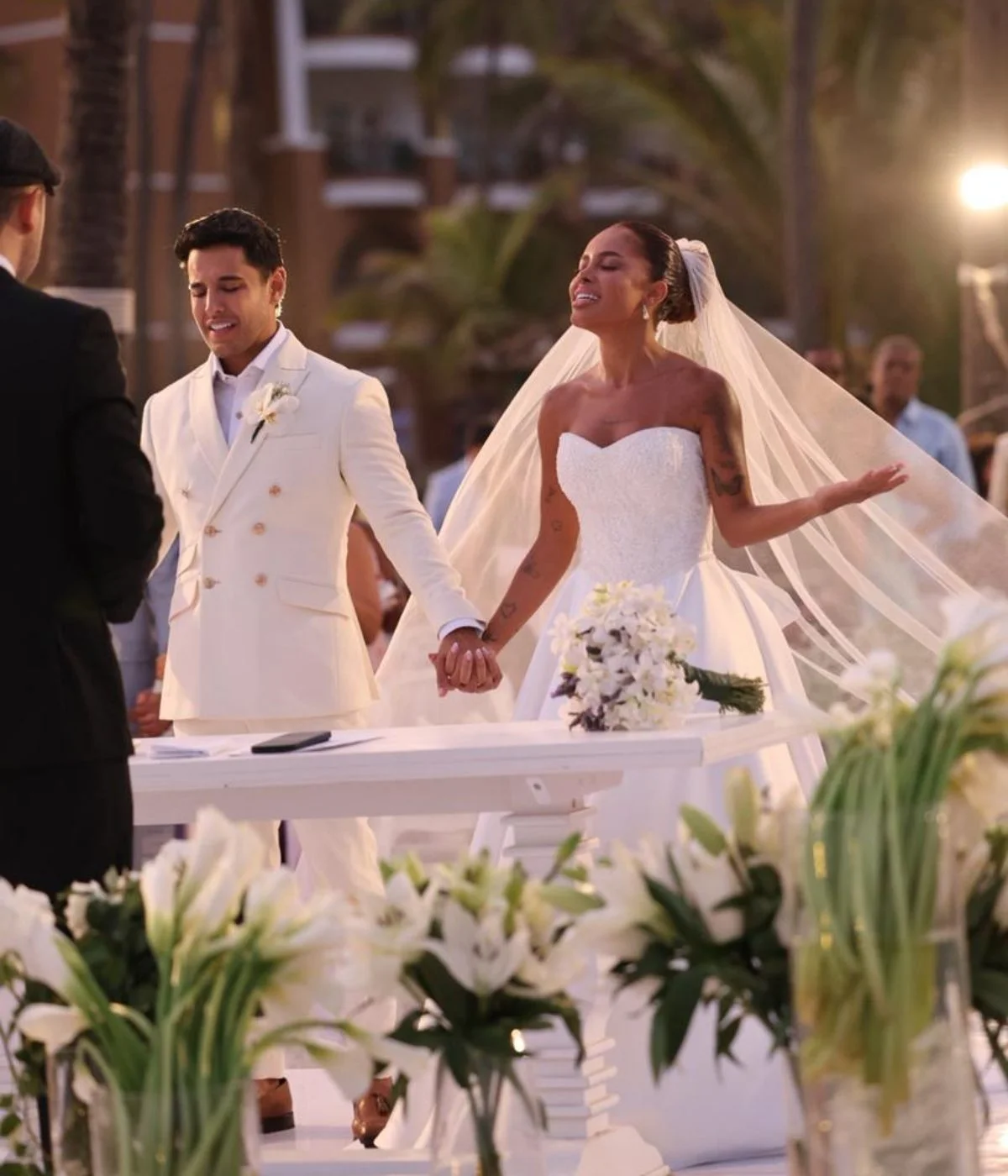 Nos vídeos e fotos aos quais a coluna teve acesso, a noiva aparece vestindo um tradicional vestido branco, estilo tomara que caia, com pedrarias, enquanto o noivo optou por um terno branco, com uma rosa da mesma cor no bolso do paletó.
