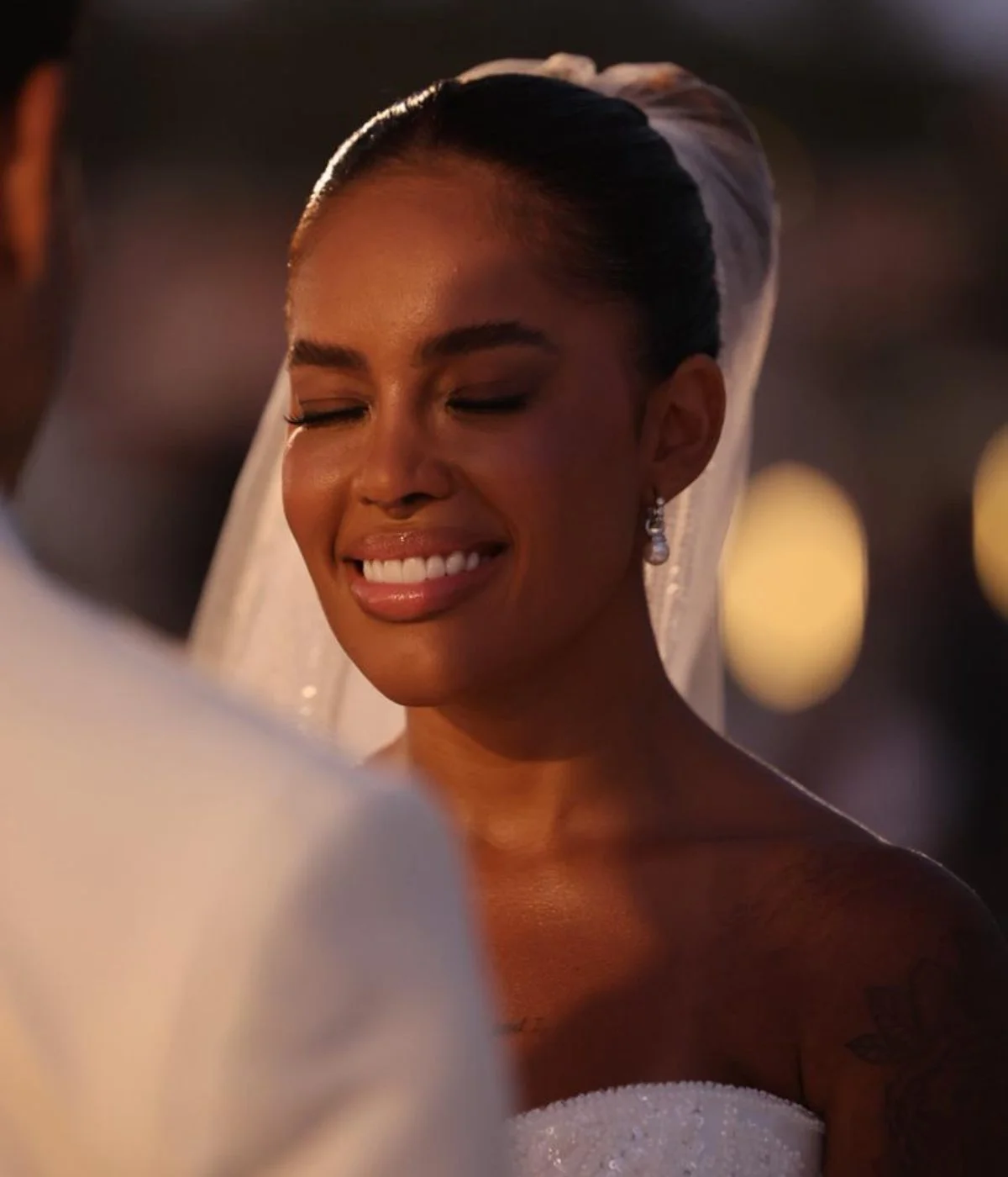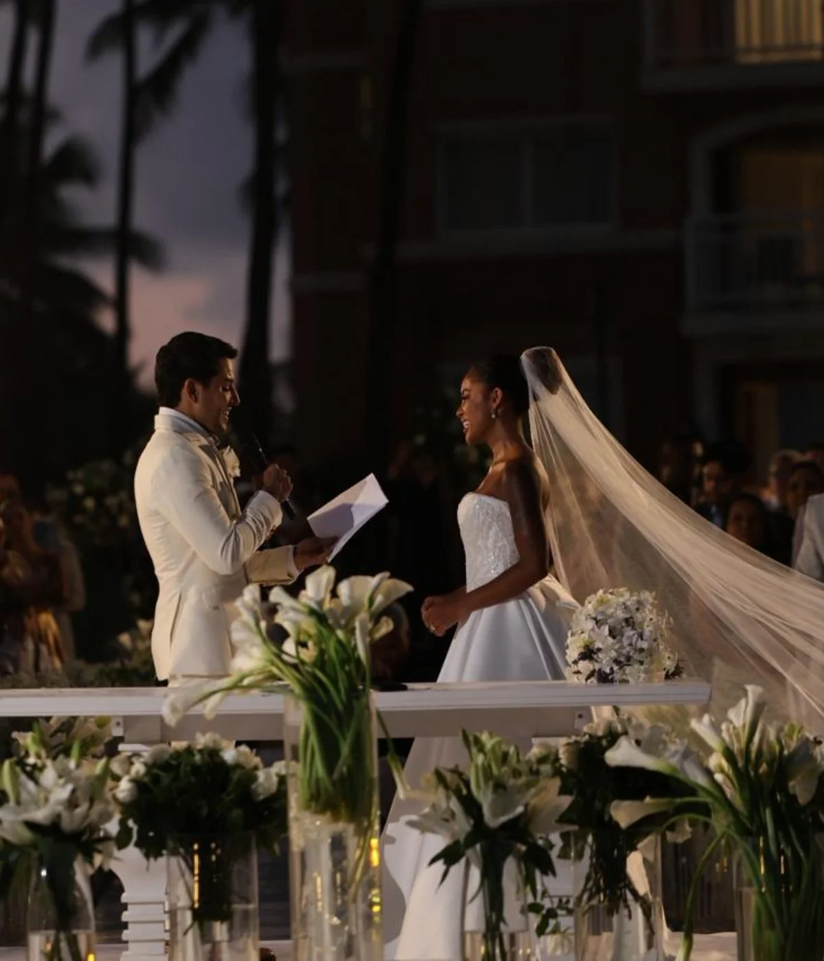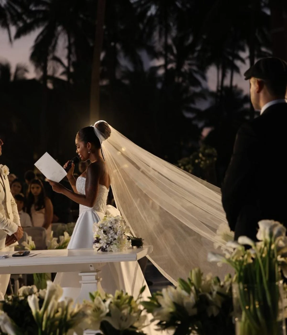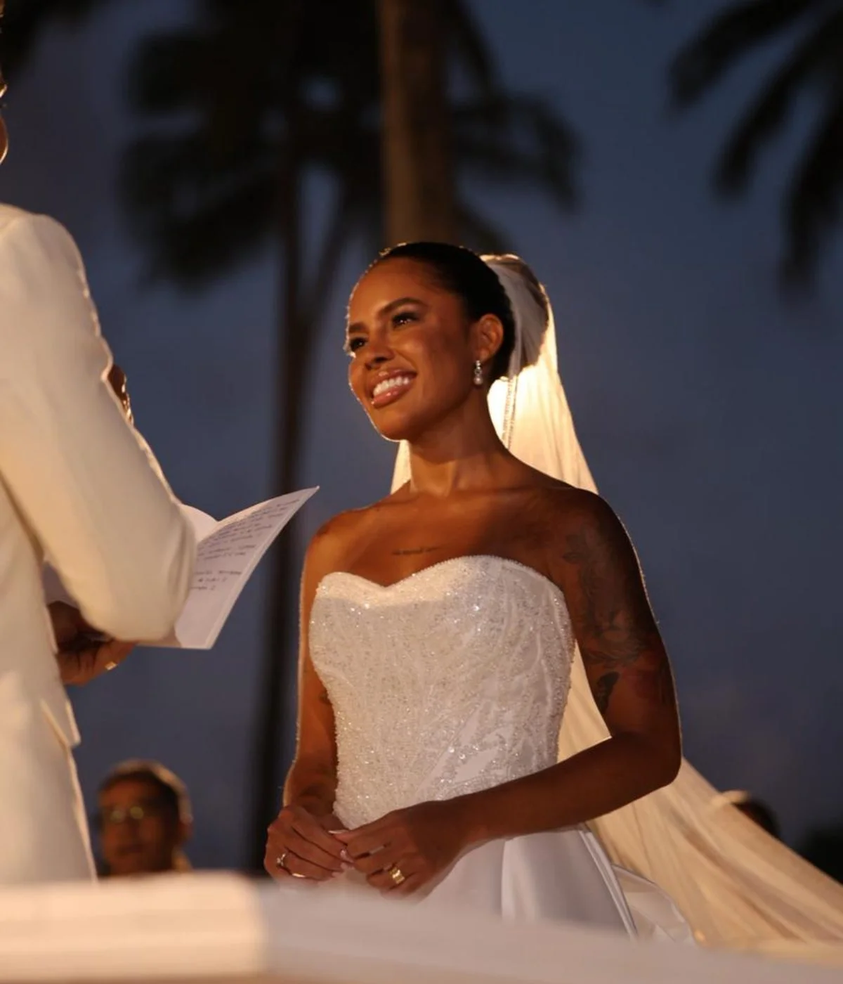 Nos vídeos e fotos aos quais a coluna teve acesso, a noiva aparece vestindo um tradicional vestido branco, estilo tomara que caia, com pedrarias, enquanto o noivo optou por um terno branco, com uma rosa da mesma cor no bolso do paletó.