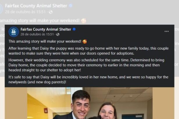 Eduardo Del Pozo e Regan Mast decidiram adiar o horário do casamento por um propósito emocionante: adotar um filhote de cachorro. O casal visitou um abrigo em 26 de outubro, quando conheceu a cadela Daisy. No entanto, a pet só poderia ser adotada no dia 28, às 11h — coincidentemente, o mesmo horário da cerimônia.