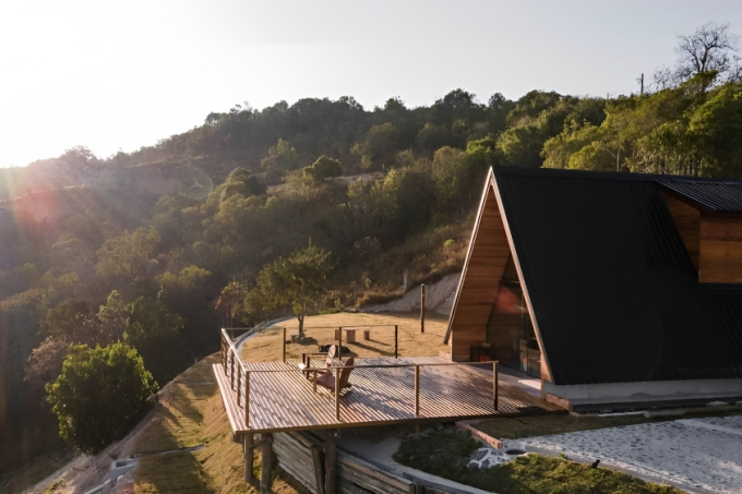 A cabana é ideal para casais que queiram se hospedar no trecho mais cheio de atrações da Cunha-Paraty. Dentro de um condomínio de chácaras, essa propriedade tem vários chalés e é quase vizinha d’O Lavandário (um minuto de carro) e d’O Olival (cinco minutos de carro), além de estar cercada de restaurantes. Como há morros e estradas de terra, carros altos se dão melhor na região. Na cabana triangular, a sala, a lareira, o banheiro e a cozinha ficam no primeiro andar, com acesso a um deck com vista para a serra e uma fogueira. A cama de casal king size fica no mezanino. Entre os mimos estão adega climatizada, toca-discos e sistema de som por Bluetooth. Reserve aqui.