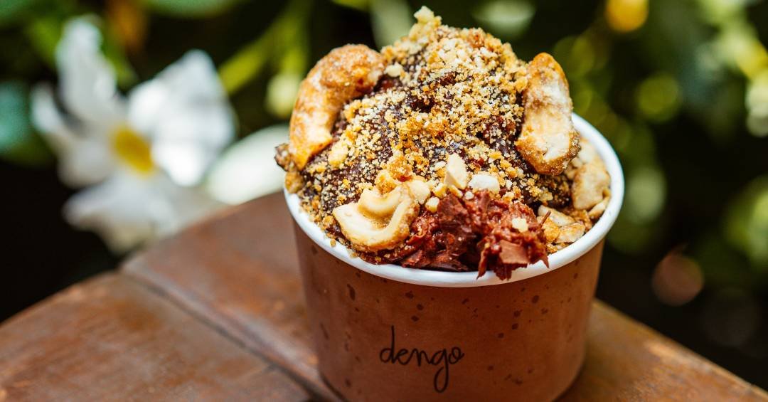 Depois de escolher a favorita, o cliente pode acrescentar duas coberturas, como crumble de banana e castanha-de-caju caramelada, cupuaçu glaceado mais uma calda, como a de chocolate, caramelo de cacau e caramelo de café. Custa R$ 21,90 pura ou R$ 24,90 com uma calda e duas coberturas.