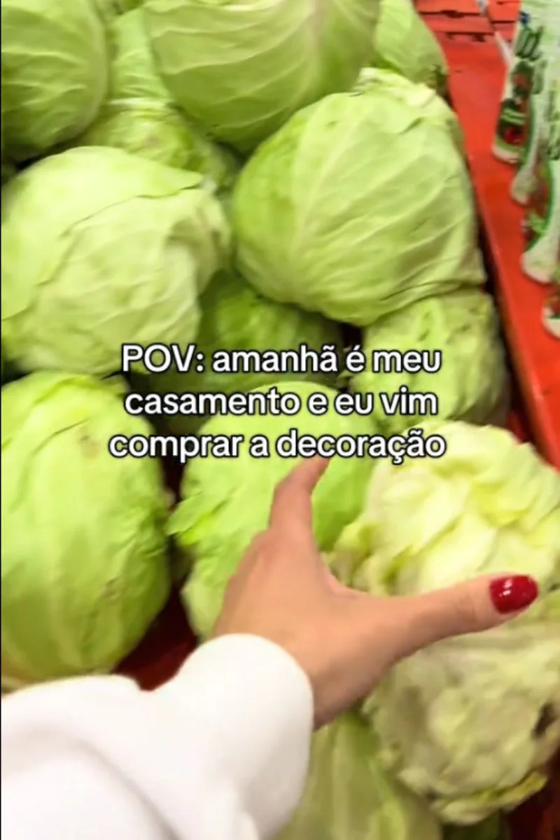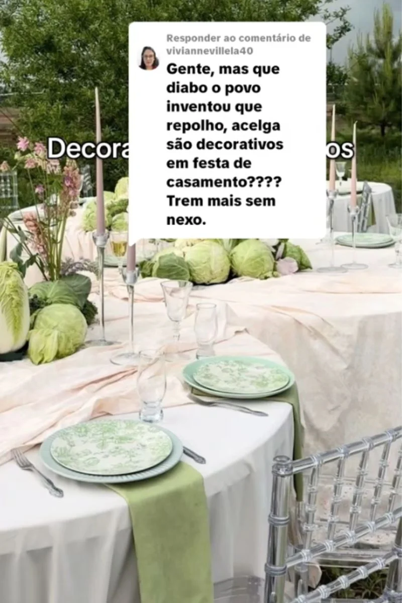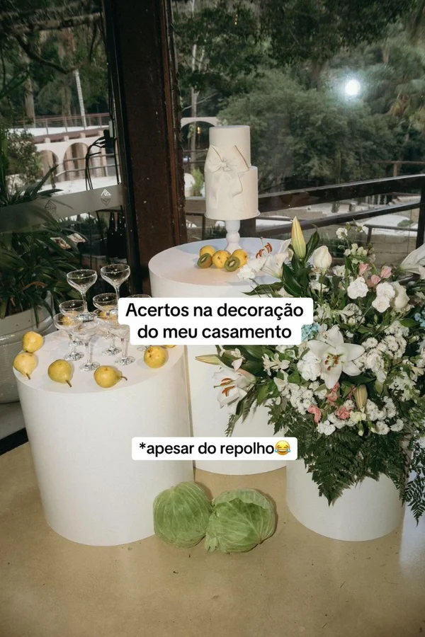Nas imagens, é possível ver peras sobre a mesa de taças, maracujás e kiwis posicionados na mesa do bolo e até repolhos solitários espalhados pelo chão. A cena gerou muitas risadas e questionamentos dos internautas, que brincaram dizendo que “o repolho deve ter caído da sacola e ficou por lá durante toda a festa”.