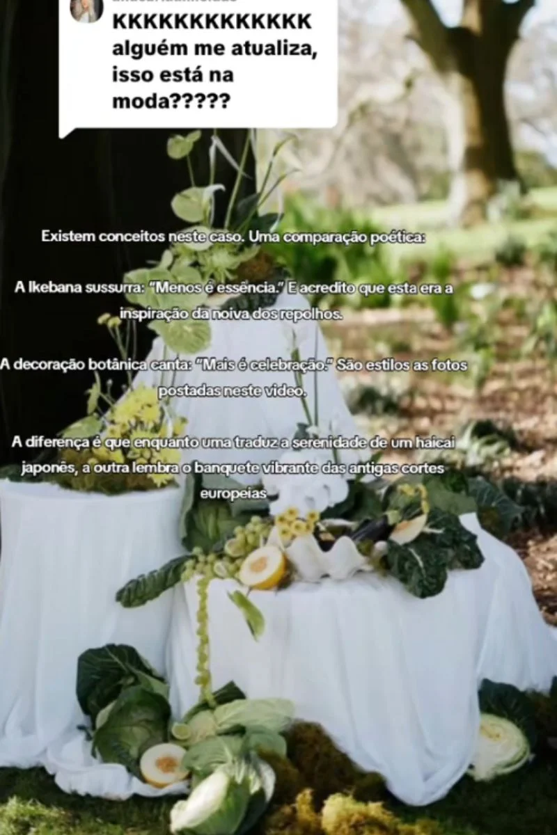 Diante da repercussão, a noiva explicou que a inspiração veio da técnica japonesa ikebana, que mistura flores, frutas e verduras em arranjos decorativos. No entanto, ela mesma admitiu que o resultado não saiu como esperado. Em tom bem-humorado, chegou a publicar: “Coisas que deram errado no meu casamento”, o que acabou viralizando ainda mais. Assista o vídeo aqui.