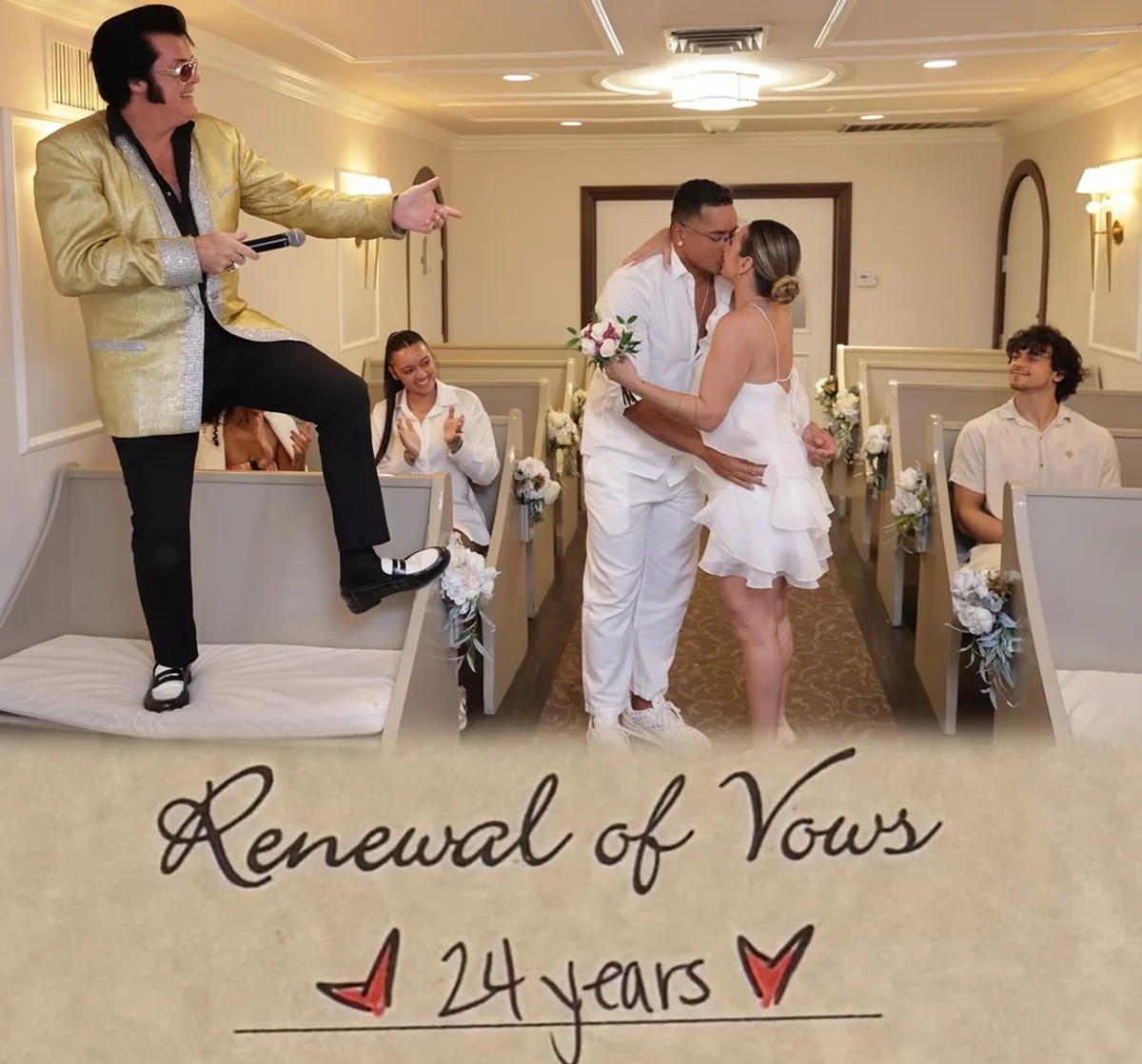 “Renovados em Vegas. + uma pra conta. Você foi, é e sempre será o meu melhor sim!”, escreveu ela na legenda de um álbum de fotos, onde os pombinhos posaram com os dois filhos, Camilly Victória e Victor Alexandre.