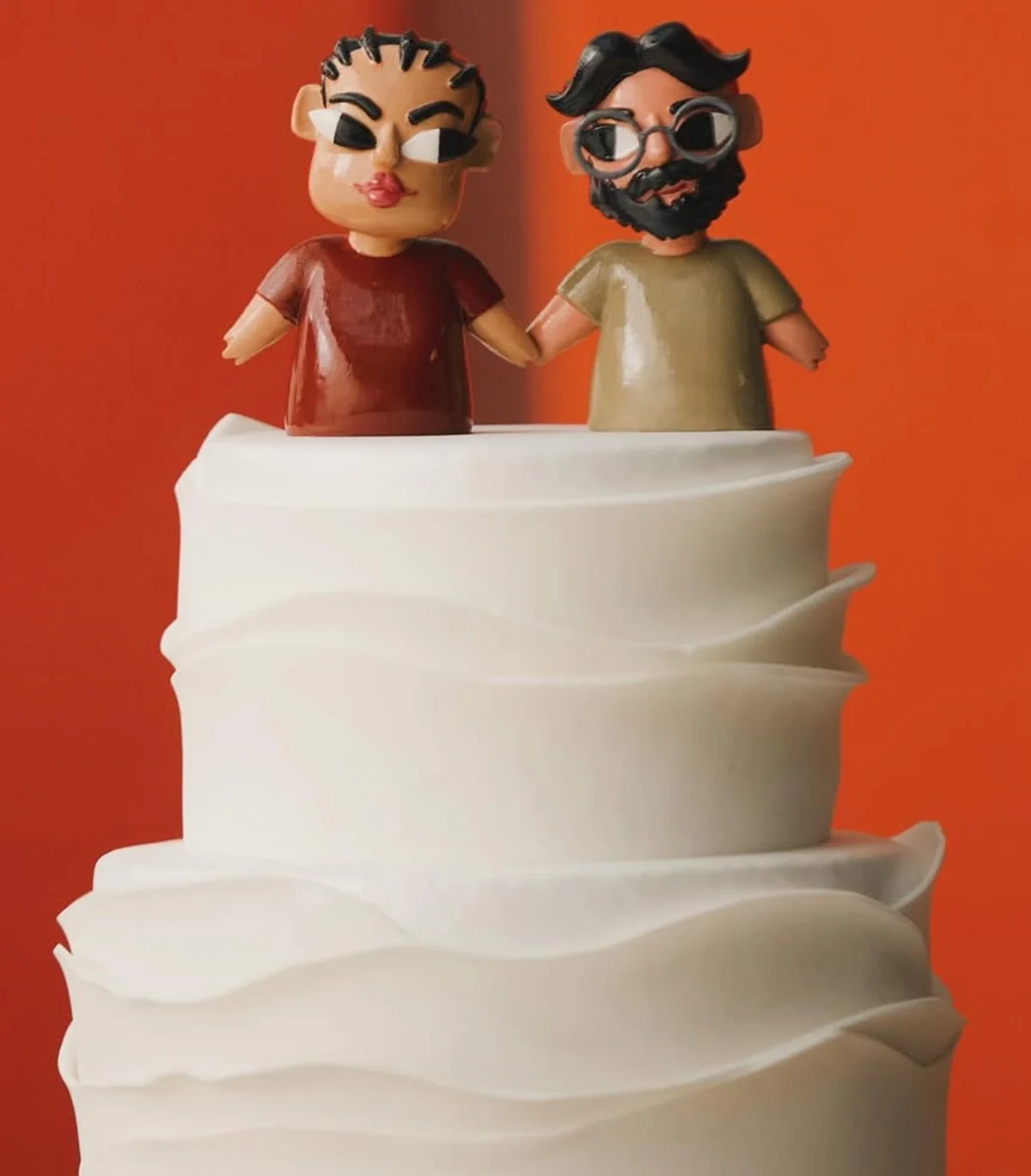 Bolo do casamento de Gloria Groove e Pedro Lopes foi branco e teve miniaturas dos noivos
