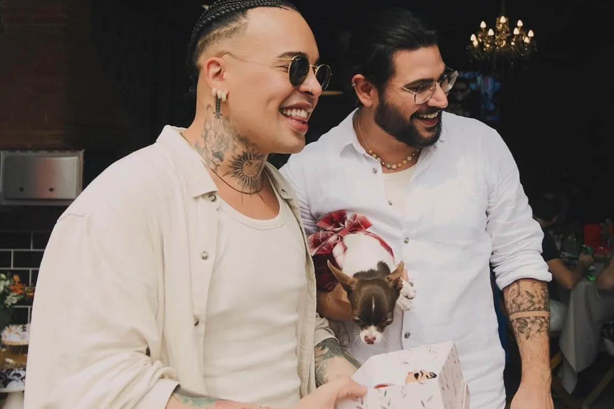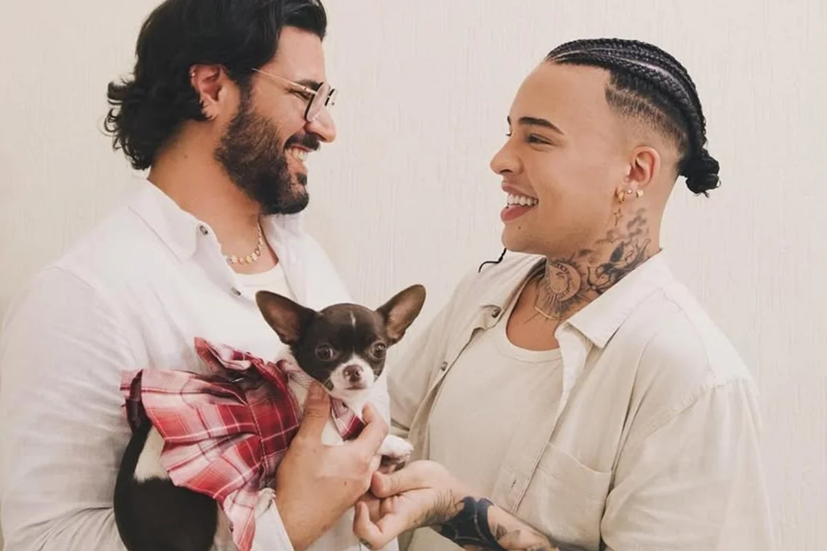 Gloria Groove e Pedro Lopes posam sorridentes com o cachorrinho do casal