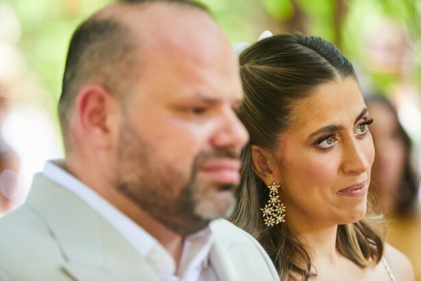 Uma parreira em formato oval circundava o altar deixando o ambiente aconchegante e bucólico. Durante os votos matrimoniais, Gabriela e Flávio reforçaram a importância de um na vida do outro e compartilharam o desejo de viver muitos sonhos juntos. O momento causou comoção e ambos não seguraram as lágrimas.