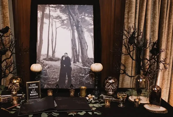 Na mesa, toalhas de mesa de veludo com estampas barrocas, sobre as quais se destacavam candelabros de prata, caveiras decorativas e porta-cartões em formato de abóbora dourada. O DJ até tinha uma placa personalizada com a frase “Até que a morte nos separe”.