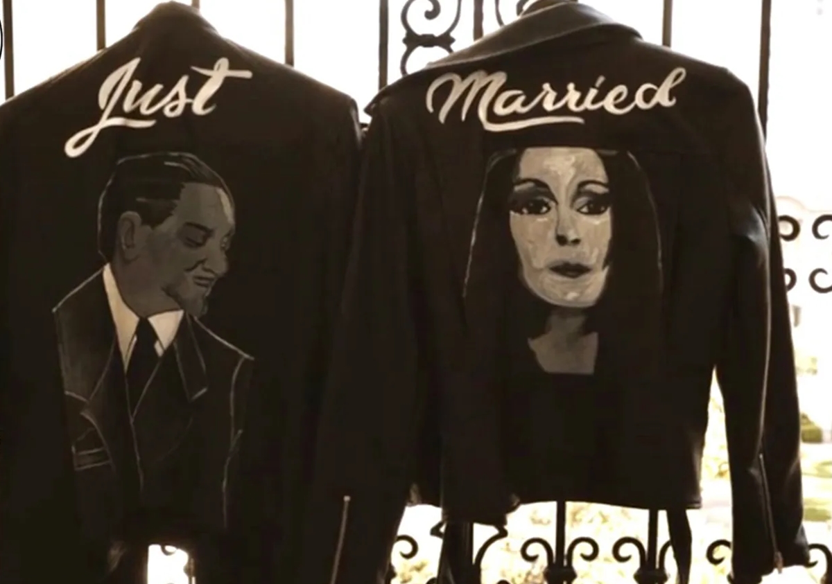 No final, quando os noivos deixaram o salão, Eduardo usava uma jaqueta de couro pintada à mão com um retrato de Gomez e a palavra “Just” (Apenas), enquanto a jaqueta de Alexis tinha um retrato de Morticia e a palavra “Married” (Casados).