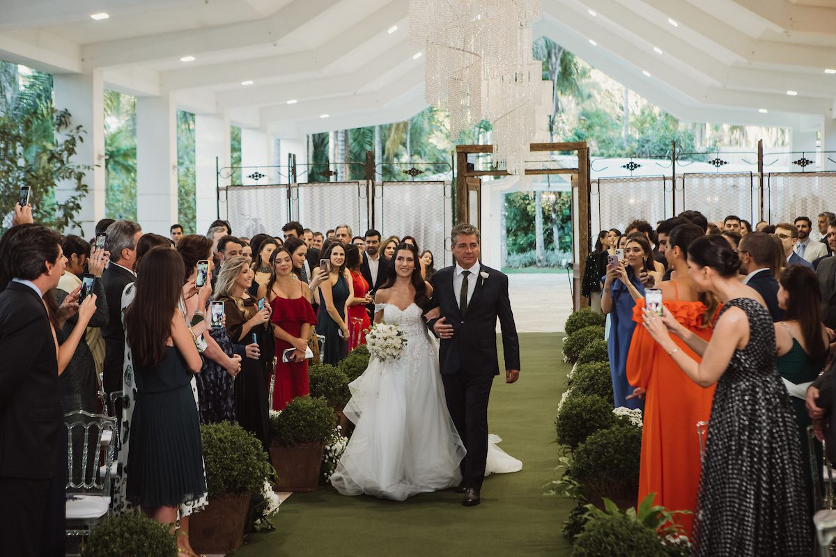 Acompanhada do pai, Cid Guardia Filho, Luciana caminhou em direção ao altar usando um deslumbrante vestido bordado e um véu clássico. Com beleza assinada por Lazaro Resende, a noiva apostou em penteado semipreso.