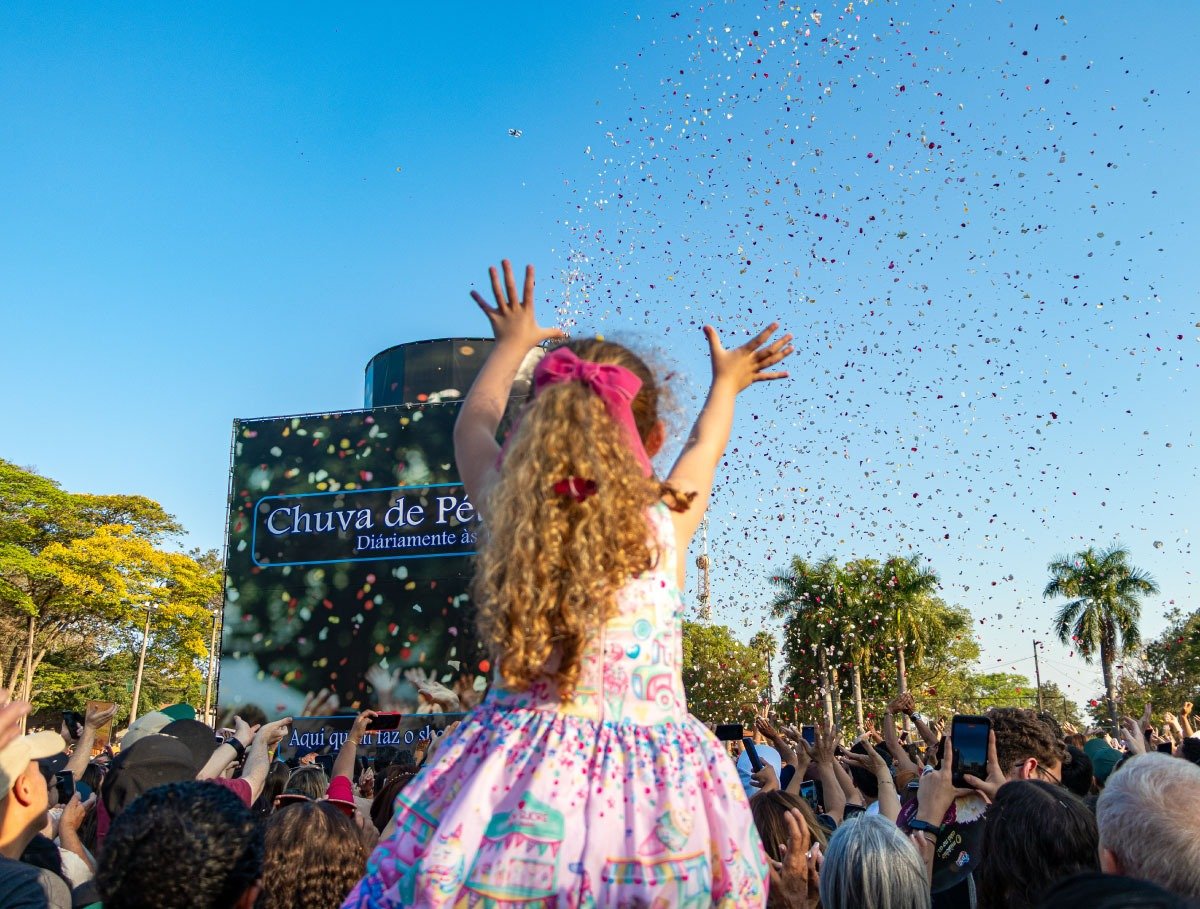 As crianças também se encantam com os cenários florais, a Parada das Flores e a famosa Chuva de Pétalas, que se tornaram símbolos do evento.