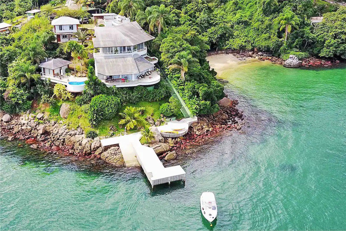 Nessa casa em Conceição de Jacareí há um deck privativo com espreguiçadeiras na beira da água, onde possível estacionar uma lancha (os proprietários oferecem o aluguel da embarcação à parte). Na área de convivência, que tem cozinha gourmet, churrasqueira e jacuzzi, o mar serve como pano de fundo. Casa adentro, são seis suítes, sala de estar e uma cozinha completa. Uma informação importante é que é obrigatório contratar o serviço de limpeza da casa, que custa R$ 250 por dia. Fica em um condomínio com praia particular. Reserve aqui.