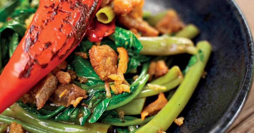 Um deles é o pak boong fai deng moo (R$ 39,00), um salteado na panela wok de agrião chinês com lascas de barriga de porco, no qual os cozinheiros procuram manter a textura consistente do vegetal.