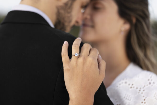 • Com solitário: quando o pedido é feito com solitário, ele geralmente é usado na mão esquerda até o casamento. Depois, pode ser mantido junto da aliança ou reservado para ocasiões especiais.