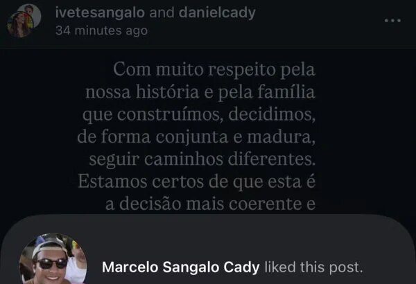 Após o anúncio do término, o adolescente curtiu a publicação conjunta pela cantora e pelo nutricionista, que também são pais de Marina e Helena, de 7 anos.