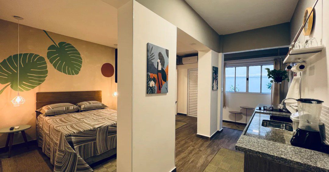 A acomodação de 55 m² é compacta. No quarto com televisão, luminárias geométricas pendem ao lado da cama de casal e há uma mesa com duas cadeiras. A cozinha tem frigobar, cooktop e utensílios básicos. Não há máquina de lavar, mas uma tábua e um ferro de passar roupa ficam à disposição dos hóspedes. O estúdio está na Rua Jesuíno Pascoal, que tem muitas opções de comidinhas, apesar de ser pequena. Algumas delas são o Bar Bagaceira e os restaurantes Jojo Ramen e Tabuleiro do Acarajé. Reserve aqui.