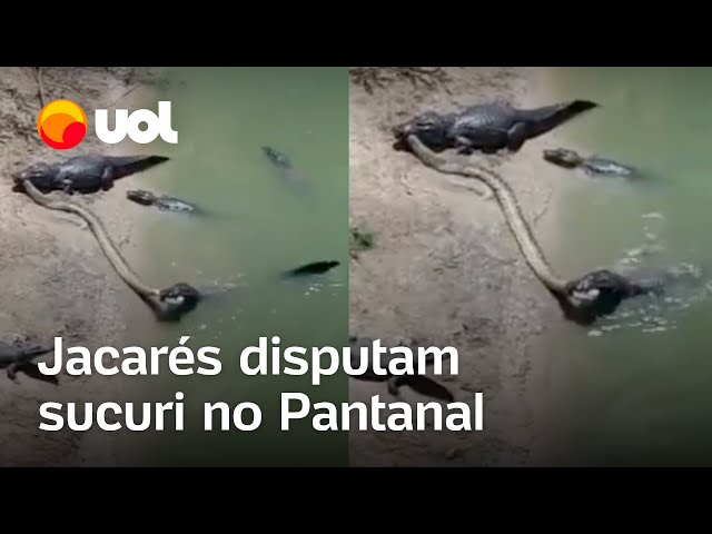 Turistas gravaram dois jacarés disputando o corpo de uma sucuri adulta, nas margens de um rio em Mato Grosso do Sul.